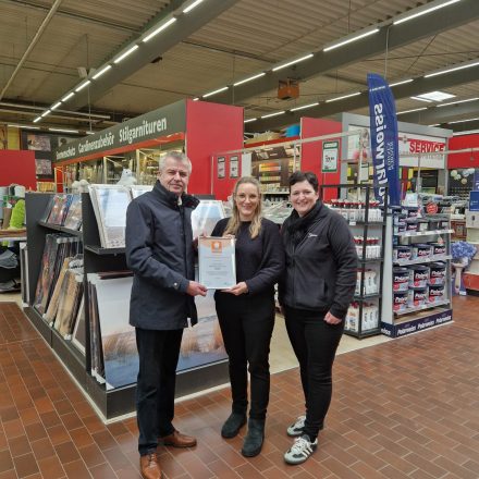 Bereits zum vierten Mal stellte sich der Hagebaumarkt in Barth einer Zertifizierung für das Qualitätszeichen für Generationenfreundliches Einkaufen des Handelsverbandes Nord (HV Nord) und erzielte dabei ein sehr gutes Ergebnis. Die geschäftsführende Gesellschafterin der Wilhelm Siemsen GmbH und Co. KG, Nina Carolin Siemsen und die Marktleiterin Verena Bobrow nahmen heute mit großer Freunde die Urkunde von Tino Beig vom HV Nord entgegen.